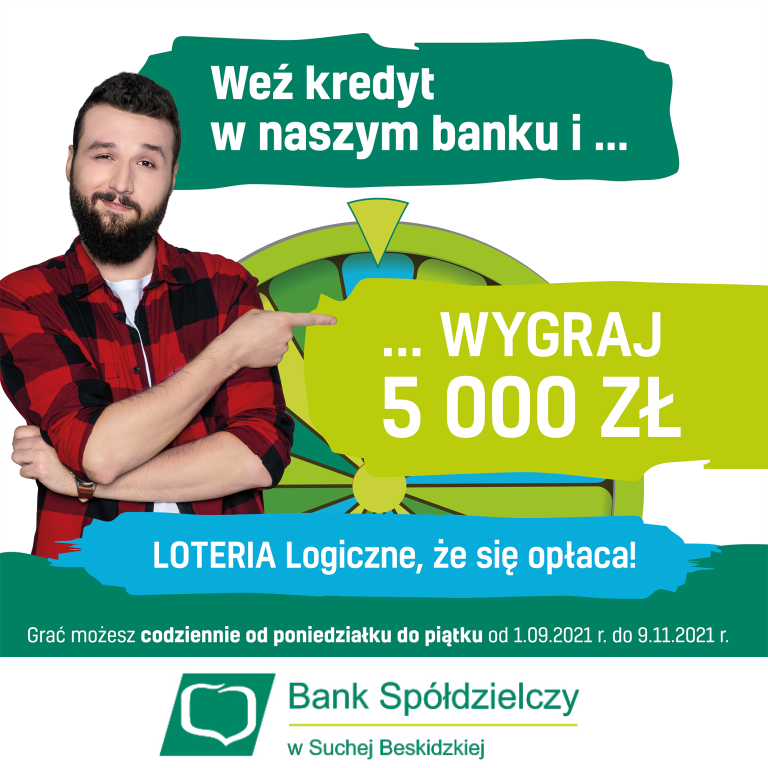 Zapraszamy wszystkich Klientów Banku Spółdzielczego w Suchej Beskidzkiej do udziału w loterii promocyjnej pod nazwą „Logiczne, że się opłaca”. Loteria obejmuje kredyty udzielone między 2 sierpnia, a 9 listopada 2021r. Losowania nagród rozpoczną się 1 września br. i odbywać się będą codziennie od poniedziałku do piątku. Do wygrania jest 50 nagród po 5.000,00 zł.